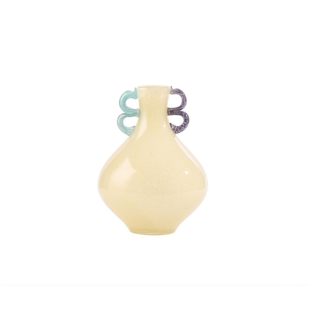 VASO DECORATIVO EM VIDRO BEGE COM ALCAS AZUL E ROXO